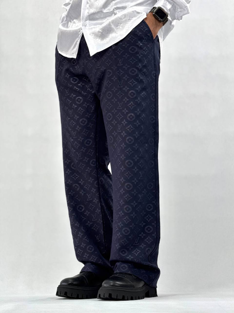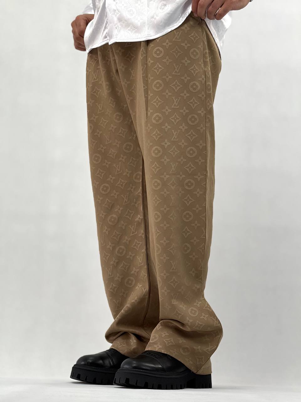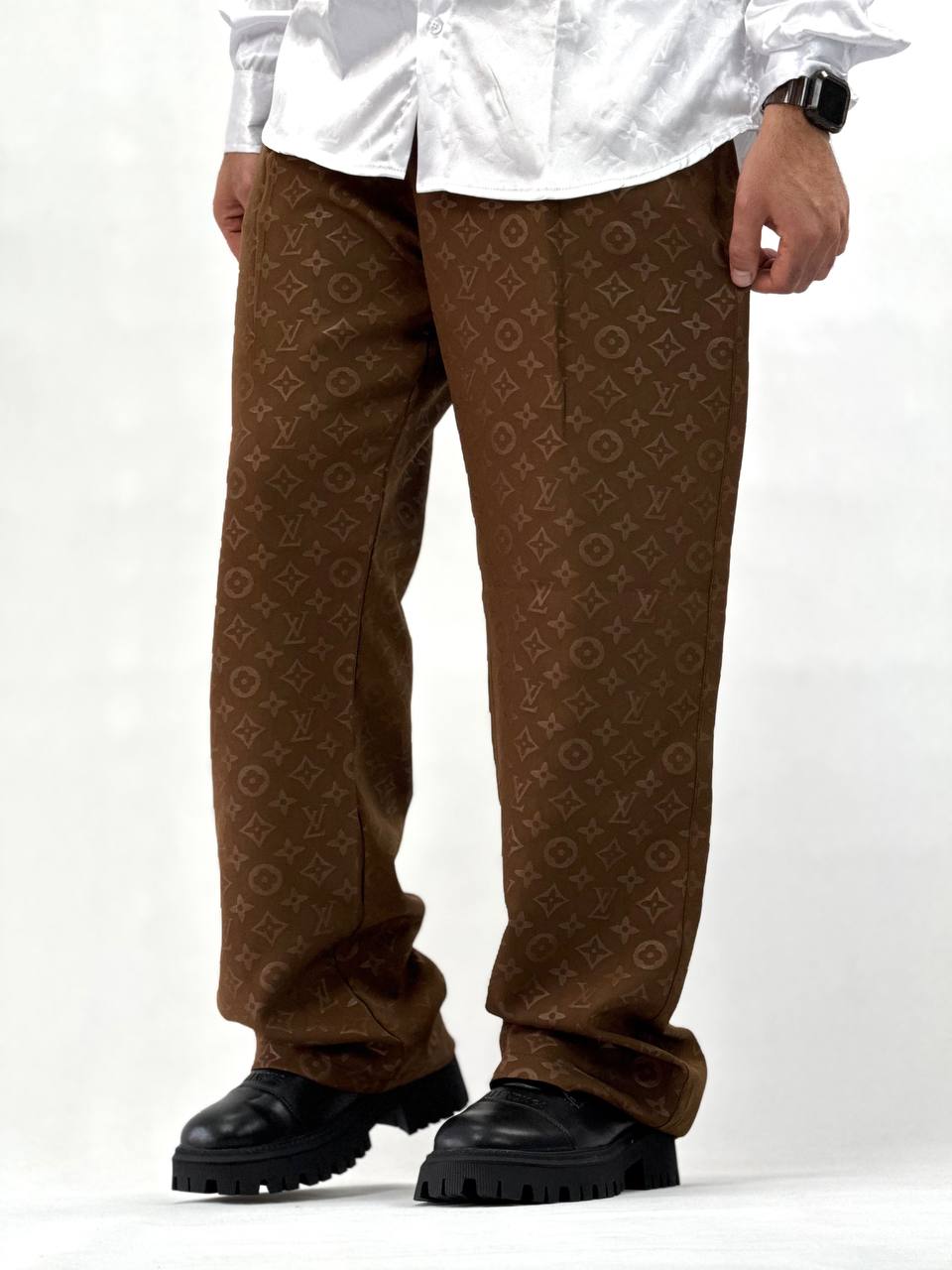 شلوار پارچه ای طرحدار بگ پشت کمر کش خورده و جای قلاب کمربند هم دارد