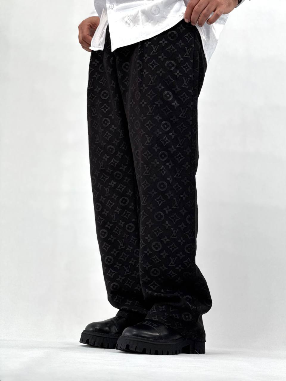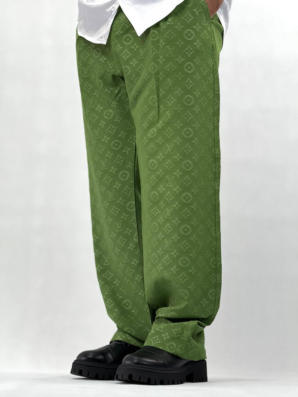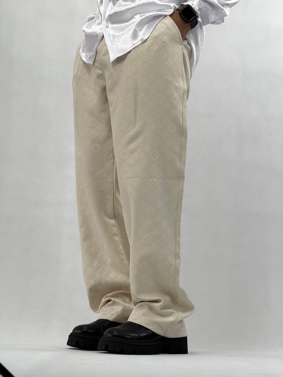 شلوار پارچه ای طرحدار بگ پشت کمر کش خورده و جای قلاب کمربند هم دارد